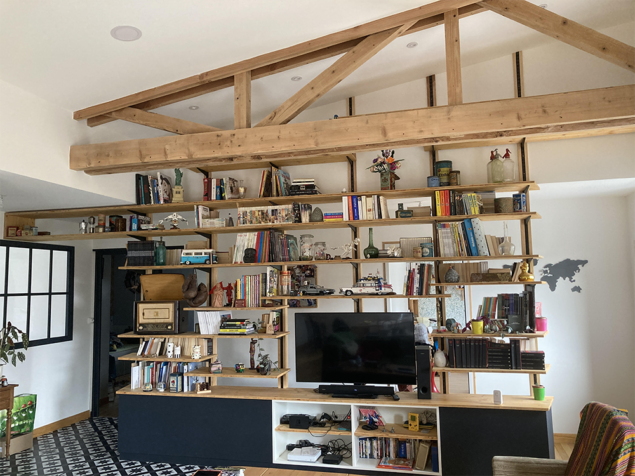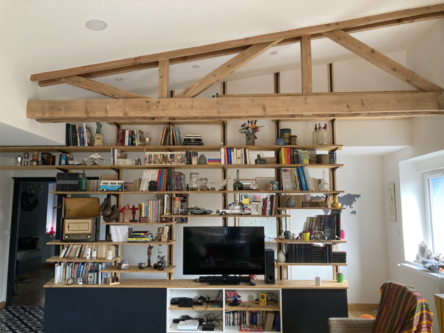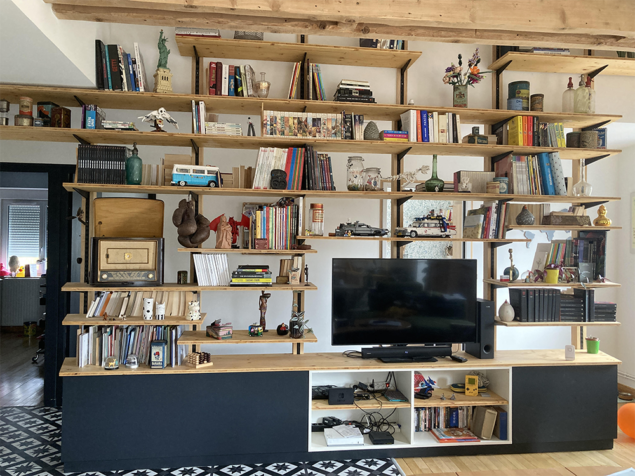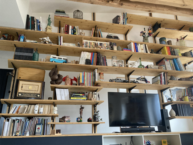 – Etagères sur crémaillères intégrées dans les montants en bois massif.
